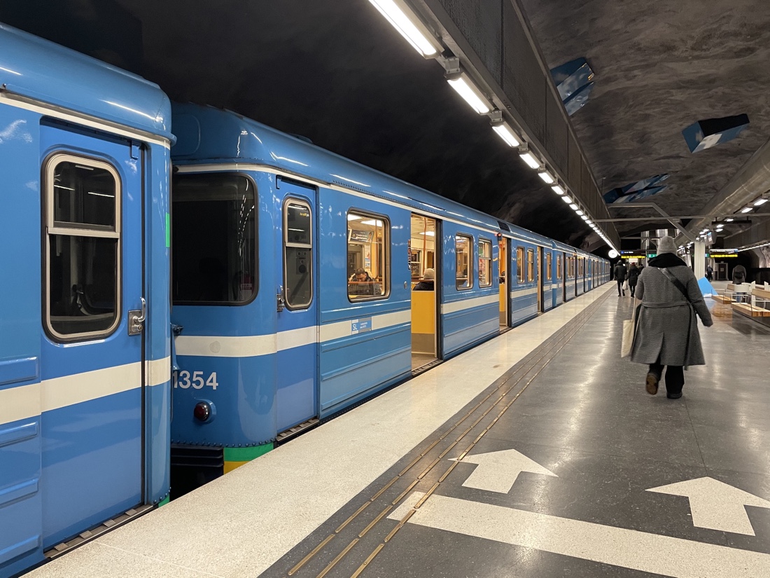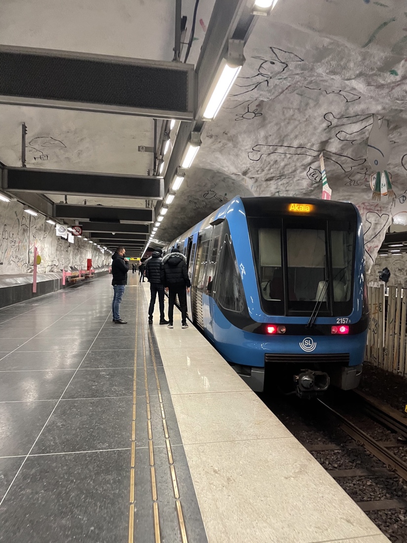 നമ്മുടെ യാത്ര തുടങ്ങുന്നത് ഏറ്റവും തിരക്കേറിയ സ്റ്റോക്ക്ഹോം സെൻട്രൽ സ്റ്റേഷനിലെ , ബ്ലൂ ലൈനിലാണ്. ഇരുപത്തിയഞ്ചു കിലോമീറ്ററോളം നീണ്ടു കിടക്കുന്നതാണ് 1975ൽ ആരംഭിച്ച ബ്ലൂ ലൈൻ. മെട്രോയിലെ ഒട്ടു മിക്ക സ്റ്റേഷനുകളും ഭൂമിക്കടിയിൽ പാറകൾ തുരന്നാണ് നിർമ്മിച്ചിരിക്കുന്നത്.അതുകൊണ്ടു തന്നെ മിക്ക സ്റ്റേഷനുകൾക്കുള്ളിൽ കയറിയാൽ ഒരു ഗുഹക്കുള്ളിൽ കയറിയ പ്രതീതിയാണ് യാത്രക്കാരിൽ ഉളവാക്കുന്നത്. ഒരുപക്ഷെ ലോകത്തിൽ ഇത്തരത്തിൽ നിർമ്മിച്ചിരിക്കുന്ന ഏക മെട്രോ റെയിൽ സിസ്റ്റം സ്റ്റോക്ക്ഹോം മെട്രോ ആണെന്ന് പറയാം.